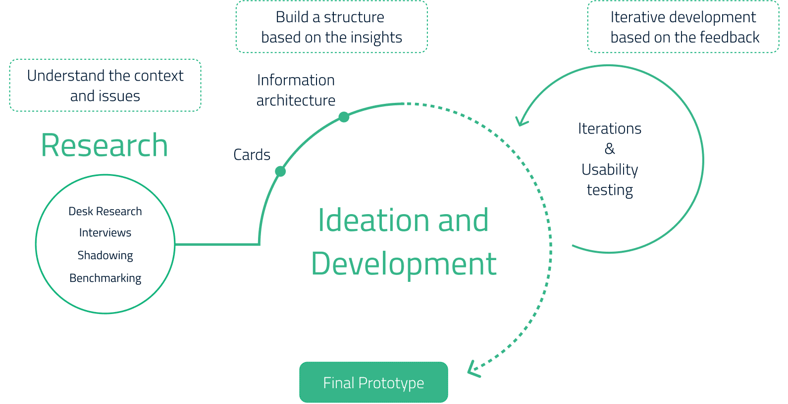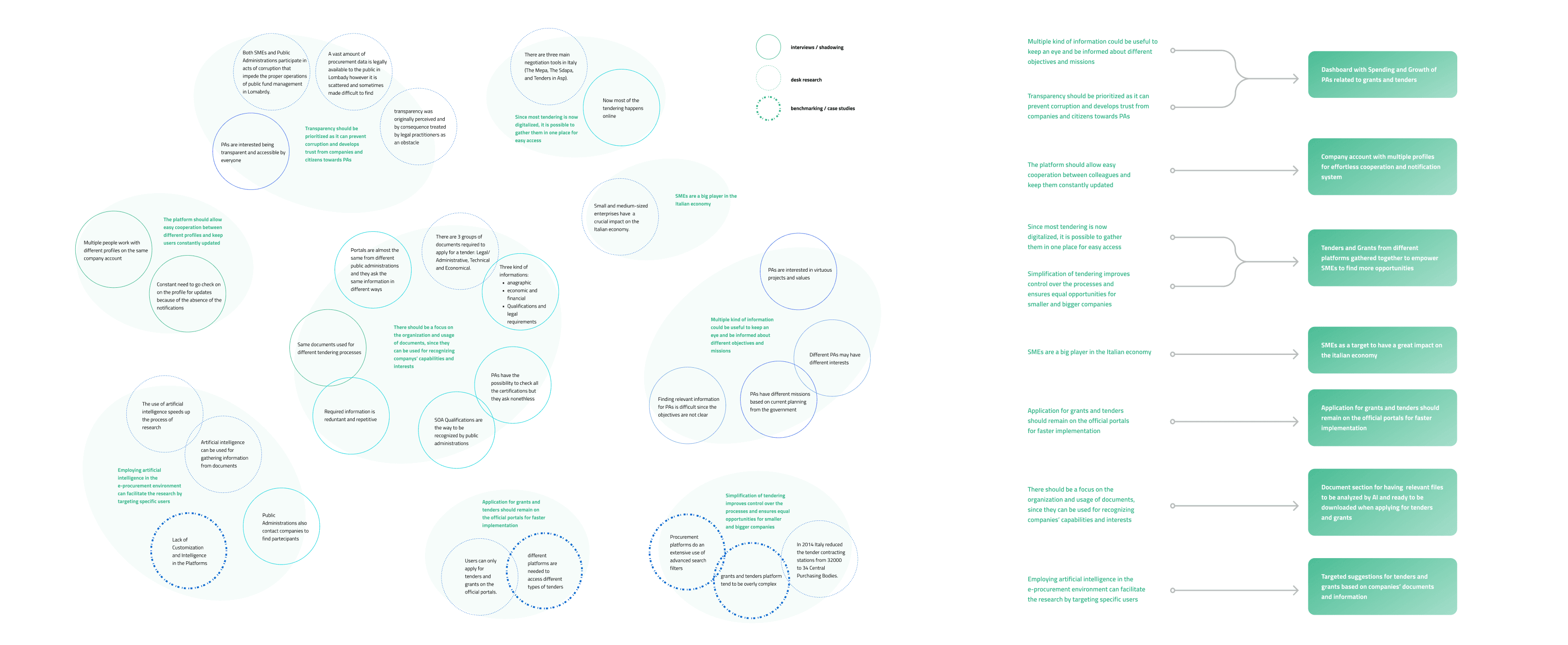 The project started with a desk research phase where legal, economical and societal knowledge about the topic was gathered, then the team performed interviews and shadowing with experts of the sector, and benchmarking of similar platforms. This allowed the team to collect a series of hints that would be then triangulated into project insights.