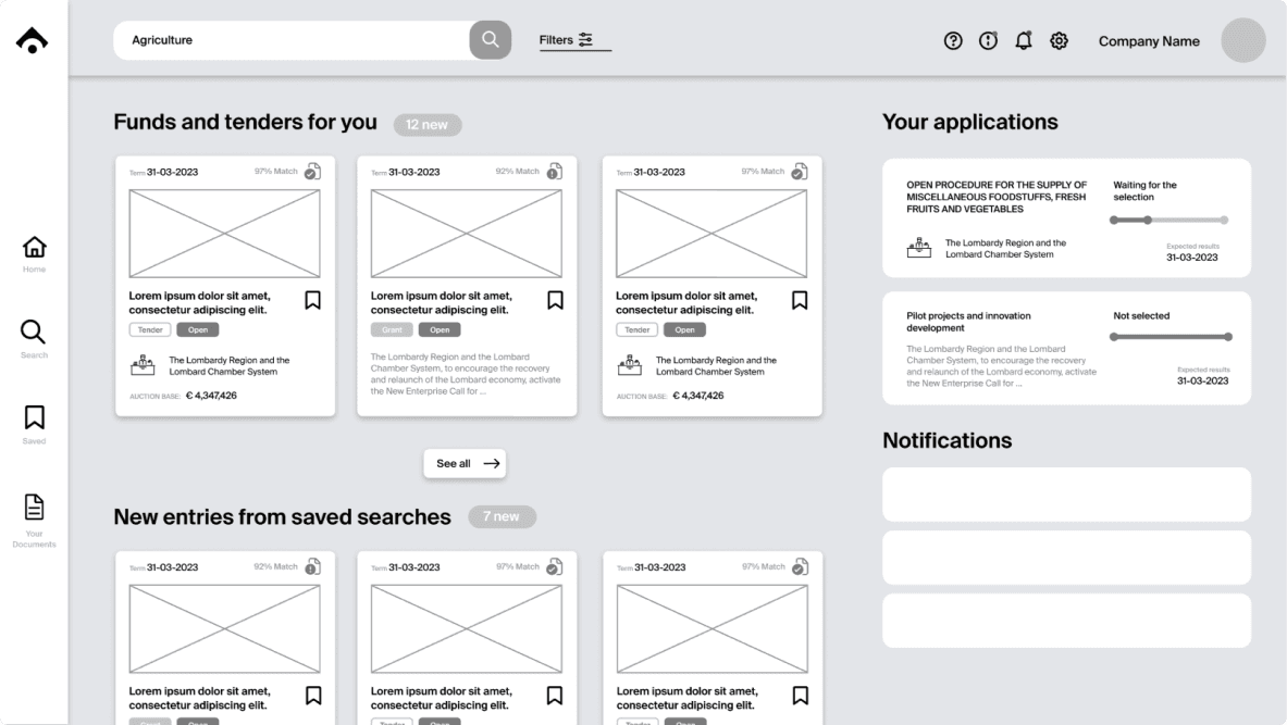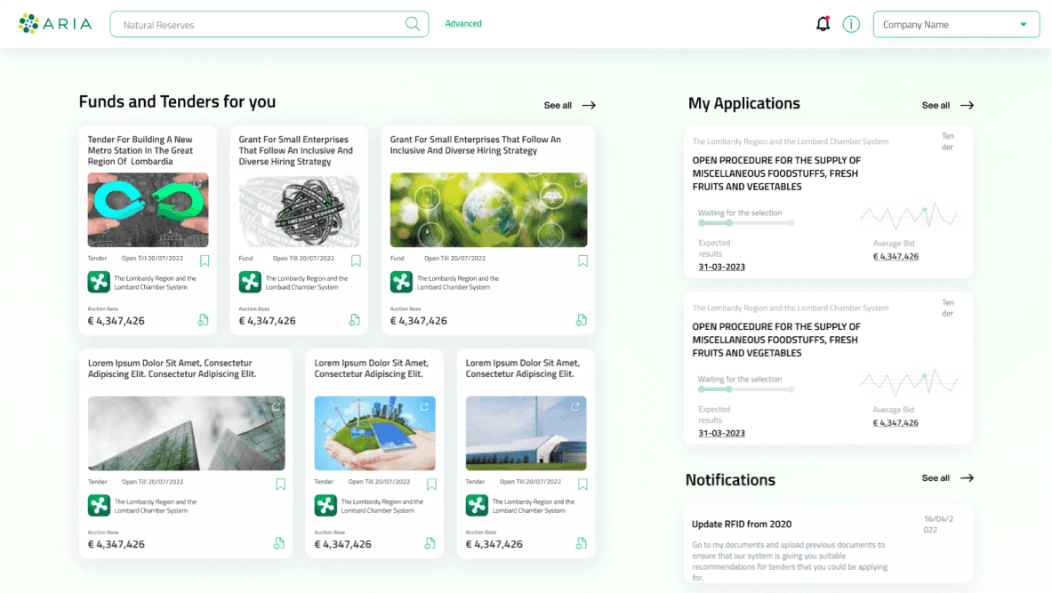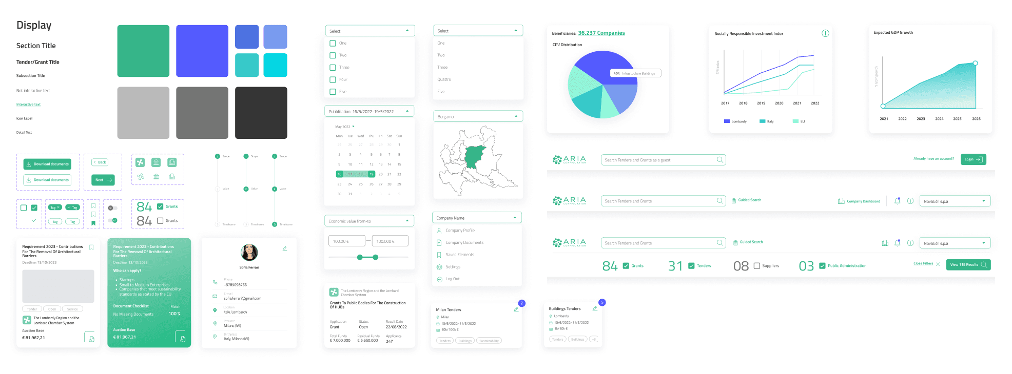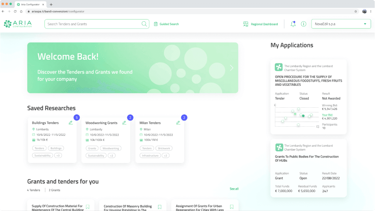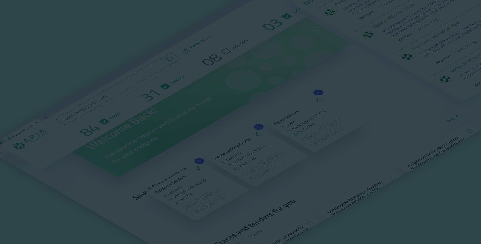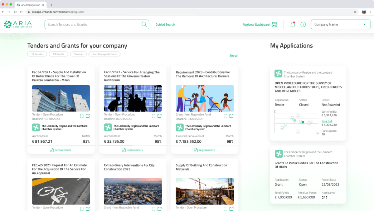 Aria Configurator is a website that acts as a portal connecting SMEs (Small and Medium Enterprises) with Public Administrations in the region of Lombardy in Italy to ensure a responsible allocation of public funds. Companies will use the platform in order to find and follow grants and tenders offered by Public Administration and stay updated on the latest policies.