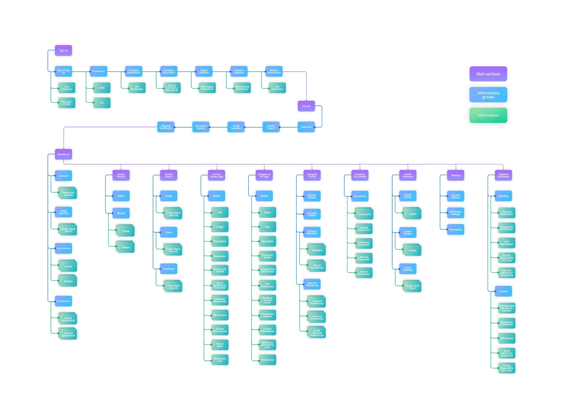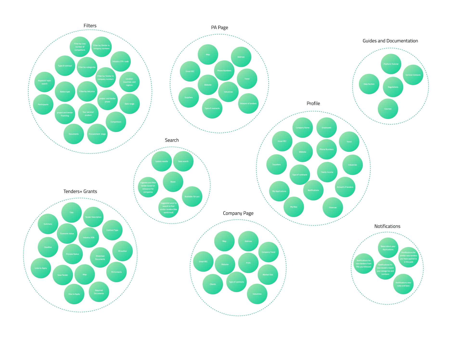 From the hints we collected during the previous research, we listed the pieces of information needed for the platform and clustered them through card sorting sessions, and subsequently reorganized them in an information architecture.