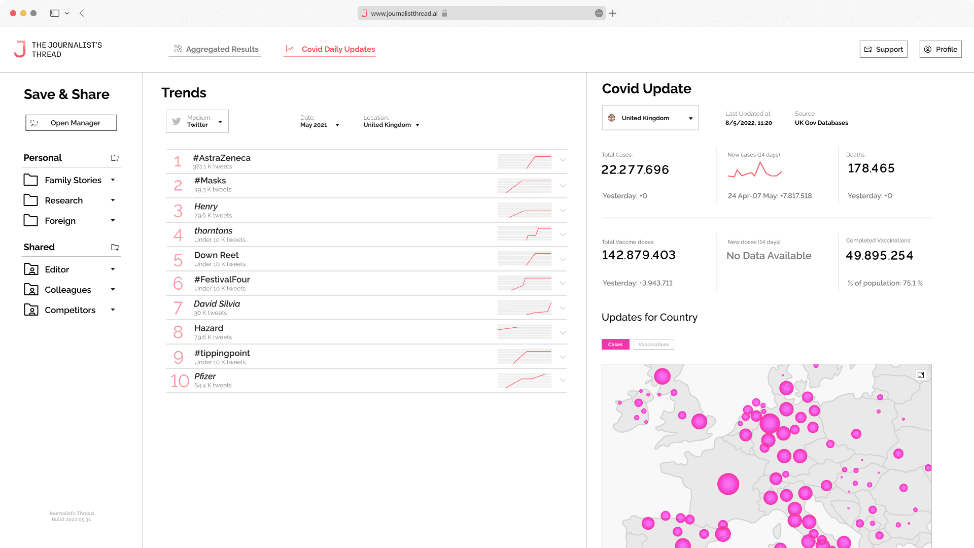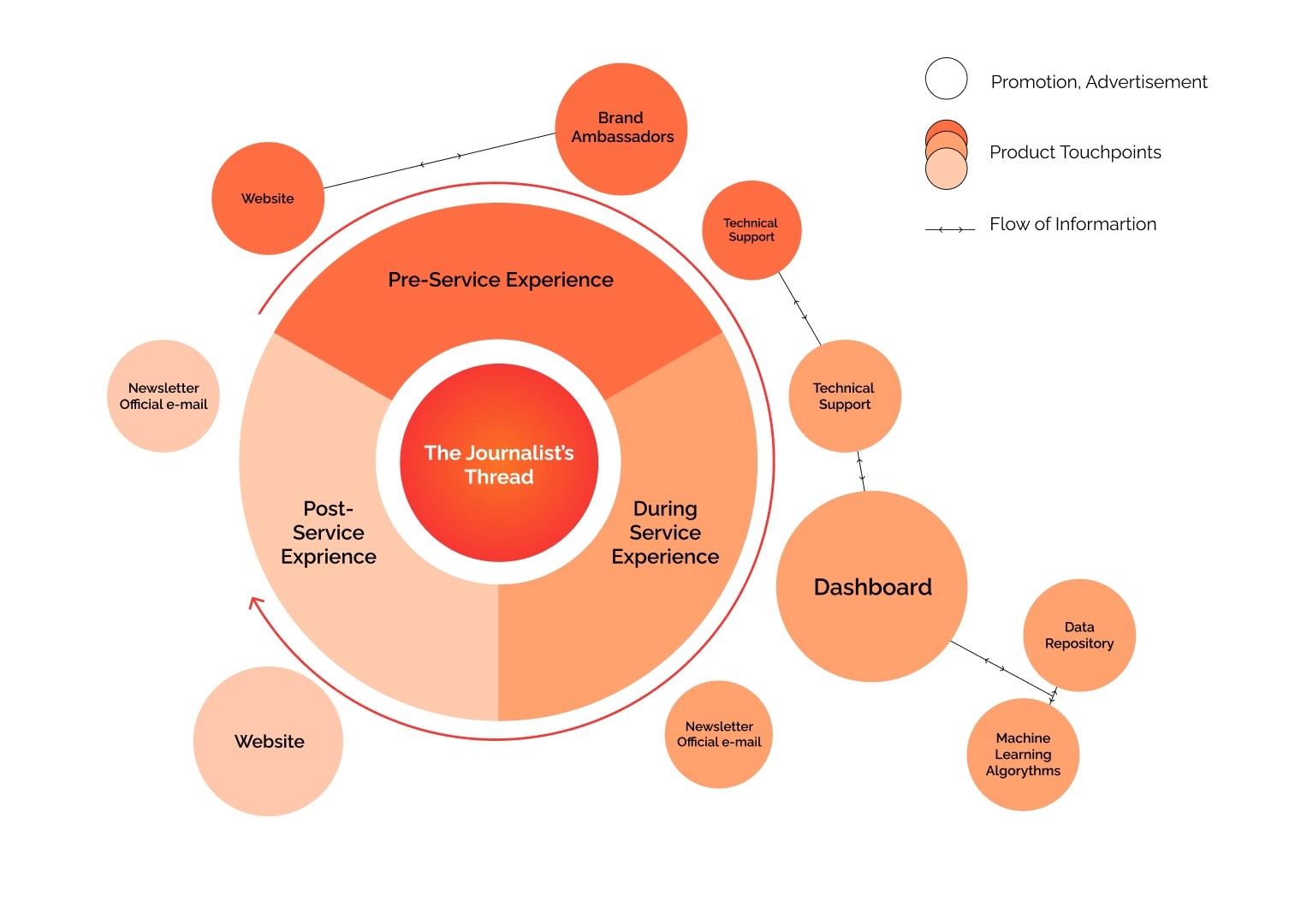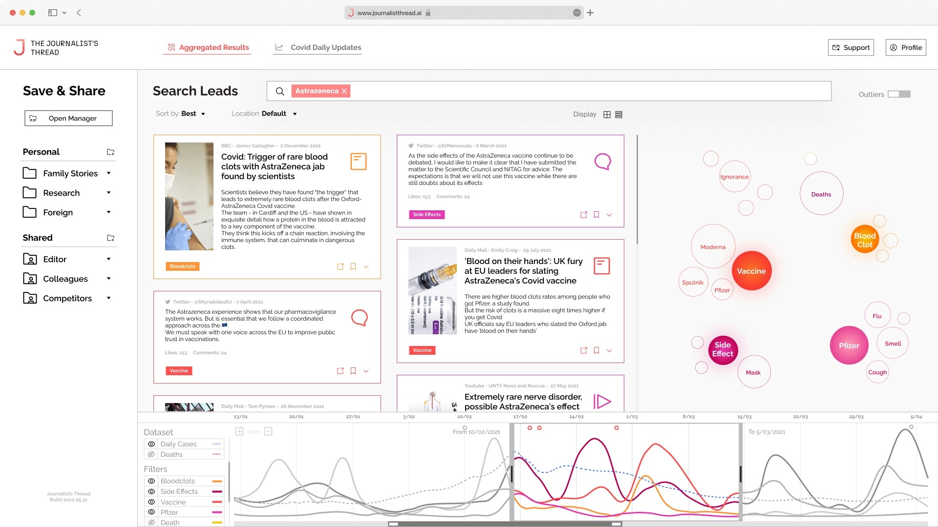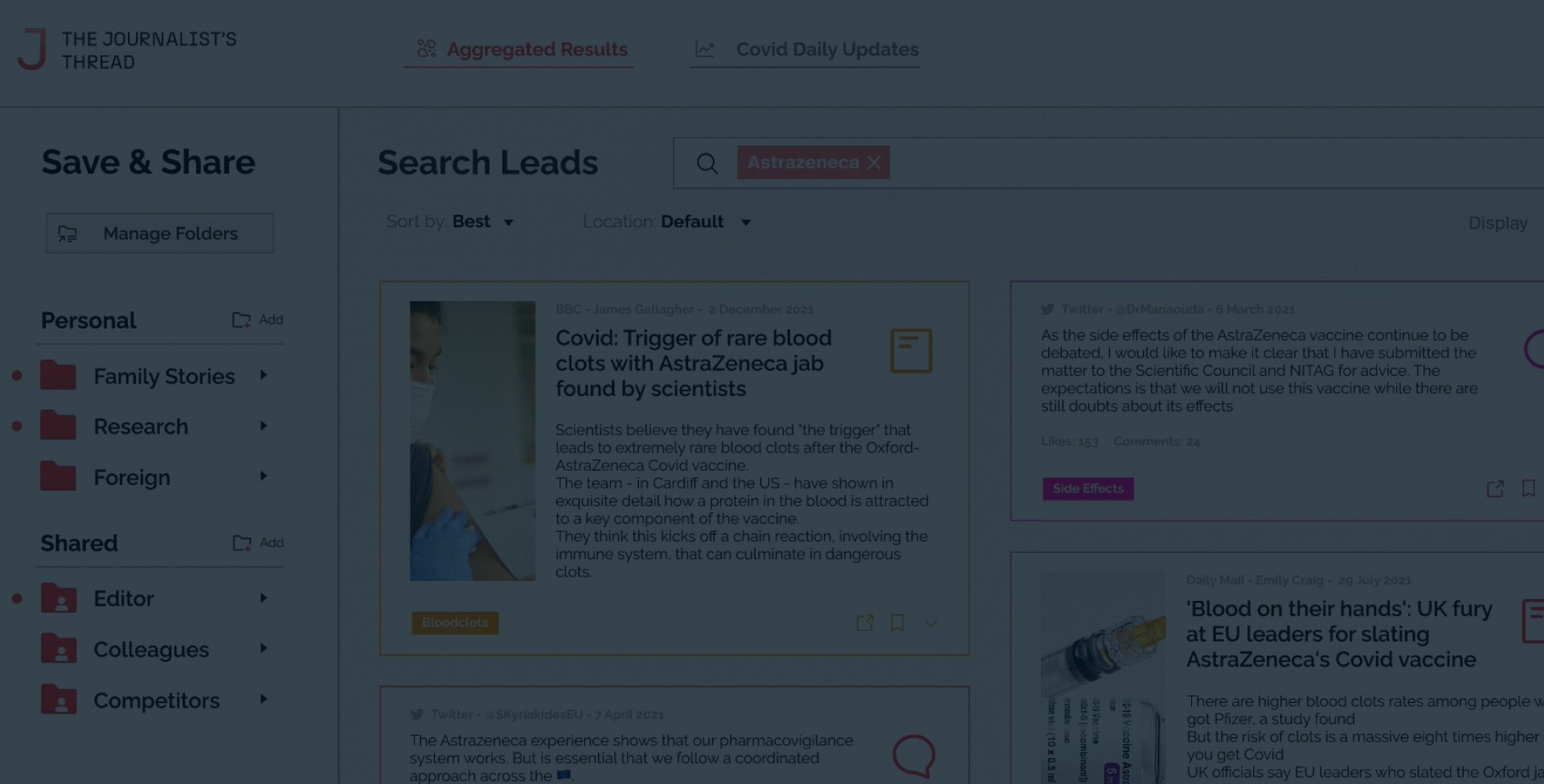 The Journalist’s Thread is a machine learning based tool that supports decision making during the newsgathering process. The service was developed in collaboration with journalists and embodies journalistic values, turning the average journalist into a Data Journalist without having to worry about algorythmic bias.