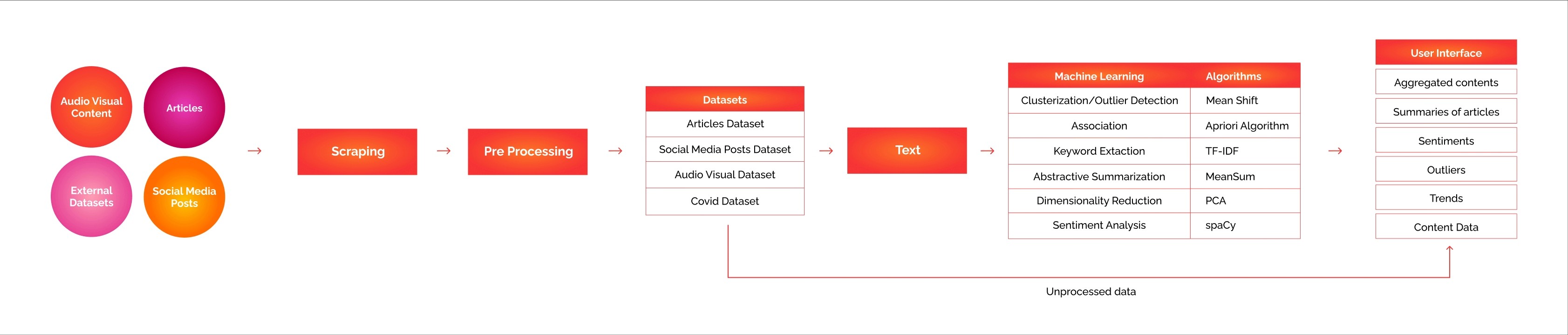 The system employes different machine learning tecniques such as: Clustering, Keyword Extraction, Sentiment Analysis and Summarization; to organize and cluster data scraped from different media such as articles, social media posts and audiovisual content, which will be then visualized in the dashboard.